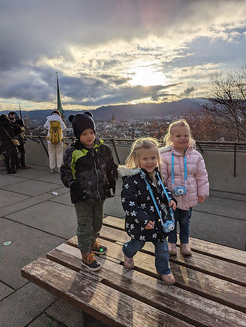 After some more wandering and some burgers for lunch at Holy Cow (a solid Switzerland chain that wasn’t crazy expensive as many of the food options will be), we walked past the UBS Polybahn, which is a mountain cable car that connects the central square with the terrace by the main building of ETH Zurich. Jackson was very fascinated by the car going over the street and asked if we could go on it. It was included with our Zurich Card City Pass that we bought for transportation so it was an easy yes. We had to fold the stroller to get it on the cable car, which was no easy feat with all of the items stored on the bottom (as a side note, we are really ready to be done with a stroller now the the girls are 3 but also not done with the stroller because then that means 3 tiny humans on foot to control, as well as having to carry all of the stuff that we usually depend on the stroller for. I digress…). This adventure was very well worth it. The view of Zurich from the terrace is beautiful. The kids also got to spend some time using their own cameras to take pictures of the buildings and each other. And the ground. And the railing. And their shoes. I tell you, I am still putting off cleaning those memory cards. Such masterpieces await.