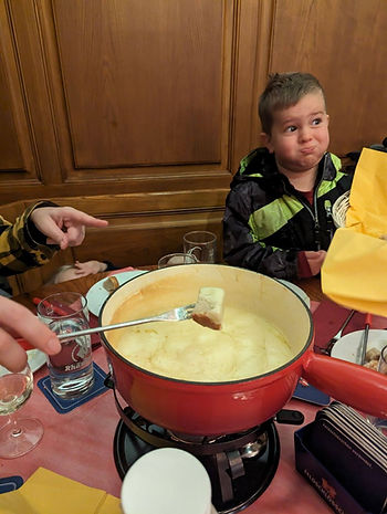 We headed back to the hostel to rest and thaw out some more for a bit and then ventured out again to have fondue for dinner, which the kids did well with. It’s nice to see the glimmers of big kids. They were very excited to dip the bread, even though they had to wait forever for it to cool. One must have fondue if you visit Switzerland in the winter, but I wish we would have asked if we could share the portion for one or two people, even though we had 3 adults and 3 kids. This restaurant only served it with bread, and I think in the future we would have shared that and gotten some schnitzel or other main dishes to share as well. We got one schnitzel and ate way too much cheese.